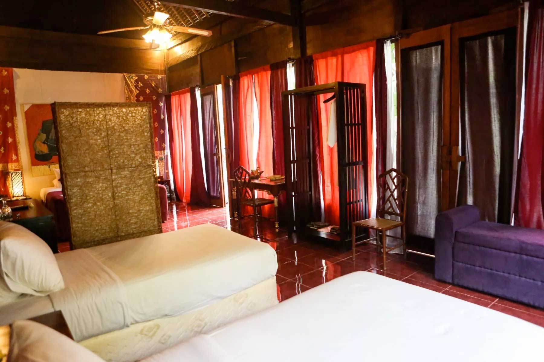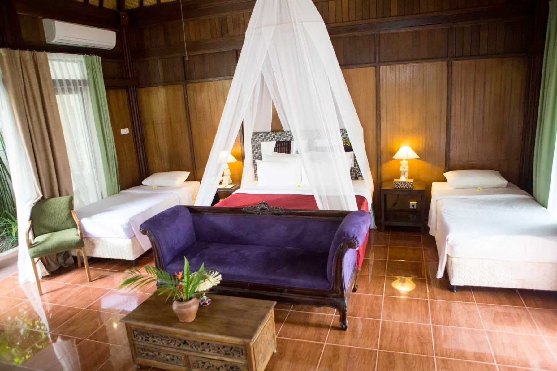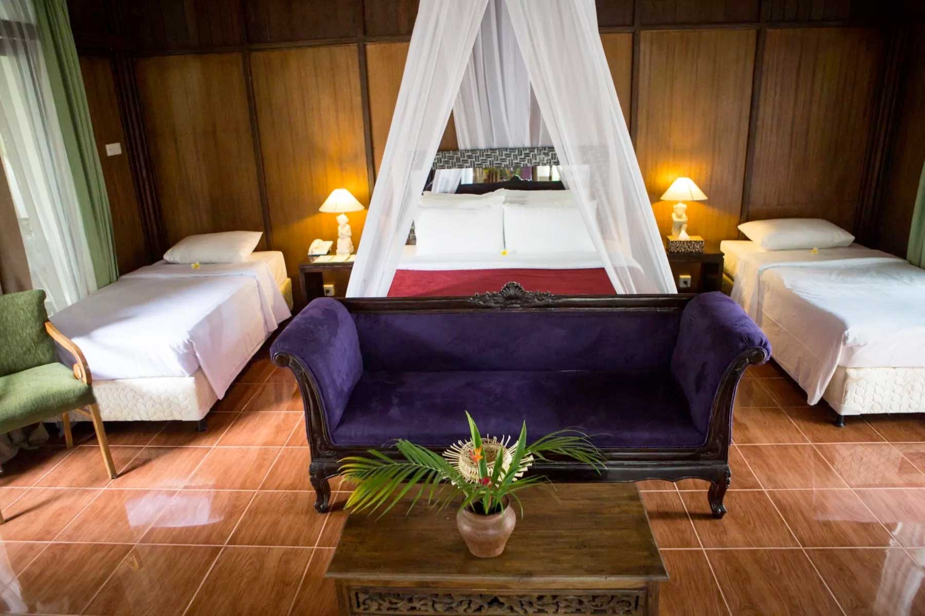 Located in the lush green gardens of the resort, the Family Rooms include one double bed and two single beds, and accommodates 4 people.